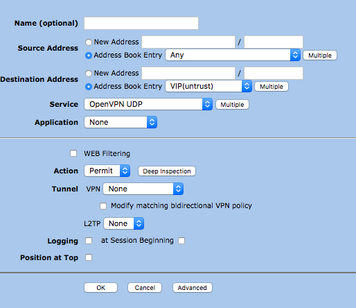 - Destination : Address Book Entry should be the VIP(untrust) in case of having multiple IPs on the router, click multiple and select the IPs you want to allow forwarding to
