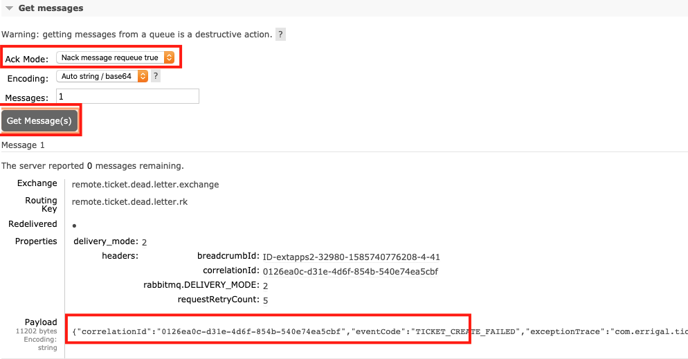 Scroll down the page and click on the Get Messages tab, then click the Get Message(s) button. Make sure to use the 'Nack message requeue' true option so that messages are not deleted. Copy the payload field into your clipboard and investigate what the cause of the issue was. The exceptionTrace field in the JSON should give a clear indicator to the problem.