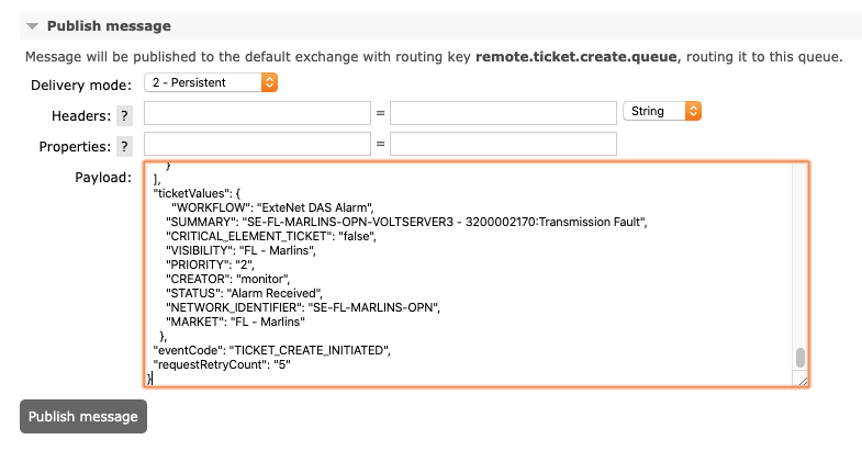 Once the JSON is corrected, navigate to the remote.ticket.create.queue and under publish message, paste the correct JSON into the payload field, ensuring Delivery Mode is set to 2 - Persistent and click Publish Message